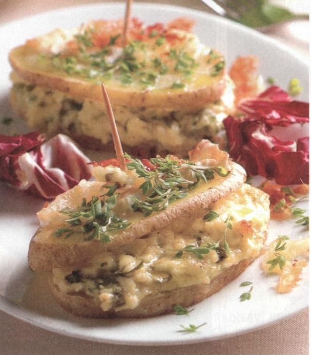 Brambory nakrájené na kolečka krátce povaříme v osolené vodě. Potom je scedíme, osušíme a necháme vychladnout. V misce smícháme tvaroh, lučinu a přidáme žloutek. Přidáme 50 g nadrobno pokrájeného hermelínu a prolisovaný česnek. Osolíme, opepříme, přidáme bylinky a promícháme. Polovinu předvařených brambor naskládáme na olejem vytřený hluboký plech. Na každé kolečko brambory dáme náplň a přiklopíme ho druhým kolečkem. Zbylý hermelín nakrájíme na plátky a položíme je nahoru. Připravené bramborové „dortíčky“ pokapeme olejem a dáme do vyhřáté trouby zapéct. Hotové ozdobíme řeřichou.