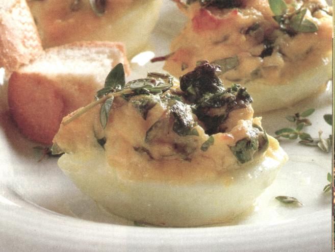 Vejce uvařená natvrdo oloupeme a necháme je vychladnout. Potom je rozkrojíme na poloviny a žloutky vyndáme do misky. Rozmačkáme je vidličkou, přidáme k nim dijonskou hořčici, zakysanou smetanu, nadrobno pokrájenou cibulku a nastrouhaný sýr. Přidáme nasekanou petrželku, tymián a estragon, osolíme a opepříme a promícháme. Směsí naplnme bílkové mističky. Naplněná vajíčka naskládáme do zapékací misky, kterou jsme trochu vymastili, pokapeme je máslem a krátce je zapečeme. Podáváme s bagetou.