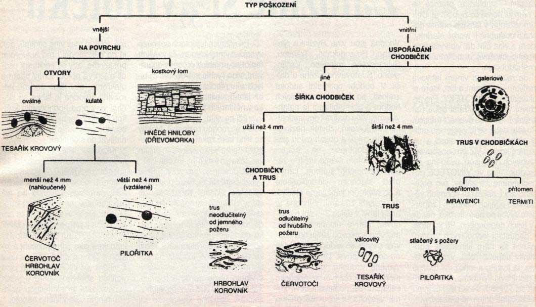 Jak lze zjištovat přítomnost škůdců? Není to vždy snadné. Larvy dřevokazných škůdců se vyvíjejí skrytě uvnitř dřeva (vývoj trvá 3-10 let) a dospělci díky své soumračné aktivitě snadno unikají pozornosti. Nejvhodnější metodou je zjišťování podle příznaku jejich činnosti, tj. změn struktury (trhliny, lom, praskání) a barvy dřeva, velikosti a tvaru výletových otvorů a zvuků, dobře známých jako „umrlčí hodinky“. Na zjišťování výskytu dřevokazných červotočů bude v blízké budoucnosti dostupný feromonový lapač.