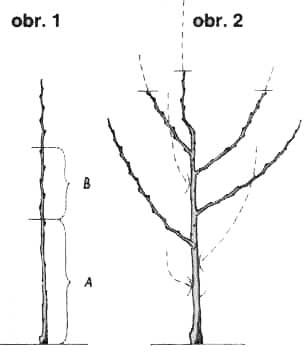 V případě podzimní výsadby se jednoleté postranní výhony zkracují na jaře o jednu až dvě třetiny jejich délky tak, aby po řezu zůstaly v jedné rovině. Dále se hladce u kmínku odřízne, nejlépe ostrým zahradnickým nožem, konkurenční výhon, popř. další konkurující výhony, u peckovin jen tehdy, ne-jsou-li příliš silné; v opačném případě se zkracují podle principu Zahnova řezu na oslabeně aktivní čípky. Terminální výhon se seřízne podle druhu, odrůdy a systému pěstování o 0,1 až 0,3 m nad úrovní zkrácených postranních výhonů. Při jarní výsadbě nutno postranní výhony řezat více, většinou na dva až tři vyvinuté pupeny. Vždy platí, aby nejvrchnější pupen směřoval ven z korunky.