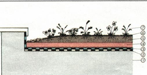 Únosnost střešní konstrukce musí spočítat specialista – stavební statik na základě známých údajů o stavbě, tj. z jakých materiálů Porost vesměs suchomilných trvalek na střeše garáže tři roky po výsadbě. Porost by měl působit záměrně přirozeně. 1 – 2x ročně je třeba vyplet rostliny, které samovolně na střeše vyklíčí. byla střešní konstrukce budována jaké jsou nosníky ap. Z výpočtu únosnosti pak vyplyne, kolika kilogramy na metr čtvereční plochy můžeme ještě střešní konstrukci navíc zatížit, aniž by se zdeformovala, nebo aby se nám stavba nezhroutila. Rozprostře-me-li totiž na ploché střeše drobný štěrk, tak vrstva 1 cm zatíží každý 1 m2 hmotností 16 – 18 kg (nutno počítat hmotnost při plném nasycení vodou). Vrstva 1 cm zeminy průměrné kvality a složení zatíží střešní konstrukci hmotností 16 – 20 kg/m2. Jednoduše si pak vypočteme, že pokud bychom na střeše rozprostřeli vrstvu 3 cm drobného štěrku jako drenáž, překryli ji geo-textilií, která má úlohu filtrační vrstvy a na ní navrstvili např. 20 cm zeminy pro výsadbu rostlin, pak musí mít naše střešní konstrukce únosnost v rozmezí zhruba 360 – 500 kg/m2 (něco váží i geotextilie a něco i rostliny, které se časem rozrůstají a zvyšují svou hmotnost). Dokonale izolovat střešní konstrukci tak, aby odnikud nemohla pod tuto izolaci vtékat nebo prosakovat srážková (nebo zálivková) voda, je druhým bezpodmínečným požadavkem pro úspěch střešního ozelenění. Na střešní konstrukci je třeba vytvořit doslova neprodyšnou vanu z tzv. hydroizolační fólie a navíc testovanou proti prorůstání kořeny rostlin.