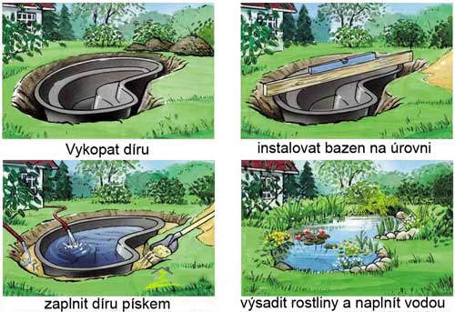 Velkou předností je snadná instalace. S nadsázkou můžeme říci, že rozhodneme-li se ráno pořídit si bazén, můžeme se už večer kochat osázenou nádrží. Stačí vyhloubit jámu, nerovnovážná místa podsypat, po usazení nádrže obsypat pískem nebo prosátou zemí, vodou z hadice spláchnout a utěsnit zásypo-vinu kolem nádrže a můžeme osazovat. Obdobně jednoduché je přemístění nádrže při proměnách zahrady. Nádrže o hloubkách od 30 do 75 centimetrů mají ve svých okrajích mělčinové kapsy a terásky vhodné pro mělkovodní a ba-žinné rostliny.
