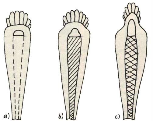 nou (tzv. kořenový krček), pletiva vnitřního kužele jsou značně zhoubovatělá a v hlavové části se někdy vytváří dutina různé velikosti.