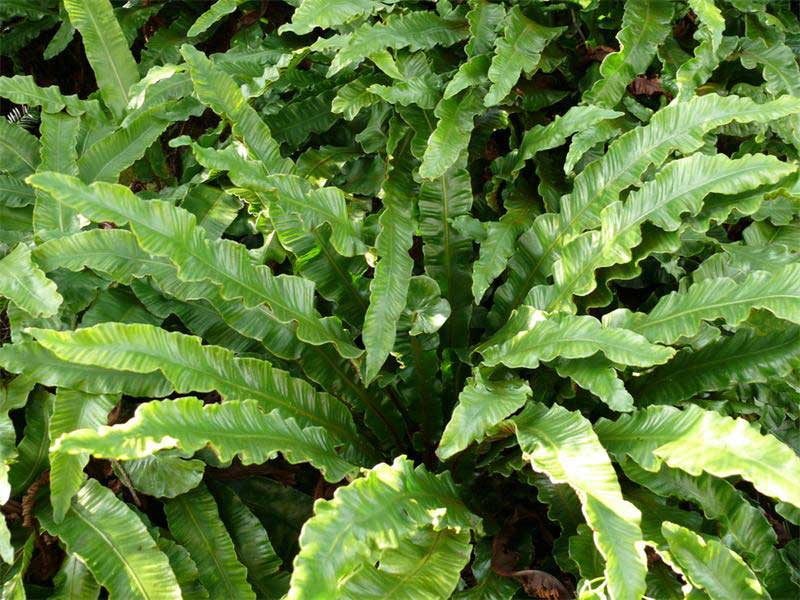 PHYLLITIS scobpendrium (jelení jazyk), má velmi ozdobné kožovité listy a daří se ve vlhkých a stinných polohách v bu-kovce s vápencovou drtí, výška 20-50 cm (existuje několik odrůd s kadeřavými listy)
