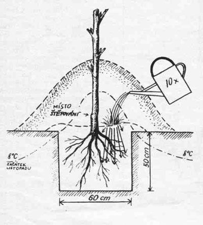 - Zeminu připravenou k zasypání kořenů musíme současně prolévat čistou vodou, aby dobře přilehla ke všem kořenům. Vodou nešetřeme, nepospíchejme, nechme ji dobře vsáknout, i kdybychom měli spotřebovat dalších deset kbelíků. Po výsadbě musí zůstat místo očkování nebo roubování aspoň tři až pět centimetrů nad povrchem již slehlé, kompostem a omítkou obohacené půdy.