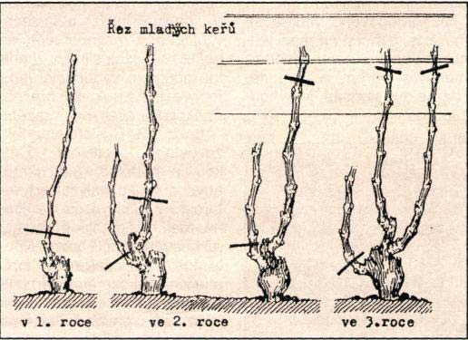 V prvním roce po výsadbě narostlý výhon seřízneme na dvě očka. Ve druhém roce dva vyrostlé výhony seřízneme tak, že níže postavený odstřihneme na jedno očko a výše postavený na dvě očka. Při bujném vzrůstu můžeme již z výše postaveného nařezat kmínek a spodní seřízneme na jedno očko. Ve třetím roce začínáme s tvarováním, proto jeden výhon vybereme na kmínek a sestřih-neme ho ve výšce 40 – 50 cm. Druhý na jedno očko (pro rezervní čípek) a třetí nejslabší úplně odstraníme. Chceme-li vytvořit víceramenný tvar, se-střihneme dva nejlépe postavené výhony v patřičné výšce a třetí na jedno očko. Tím vytvoříme základ pro další tvarování keřů v příštích létech. Z vrcholových oček vyrostlé výhony ohýbáme a vyvazujeme do předpokládaných tvarů. Během vegetace vyrašená očka na kmíncích vylamuje-me. U svislých tvarů ponecháme kmínek co nejdelší a od 50 cm výše vyrostlé letorosty nevylamujeme, ale ponecháme je pro nařezání čípků v dalším roce. Výhonem z nejvýše postaveného očka kmínek podle potřeby prodloužíme. Kmínky mají být vypěstovány jednorázově, protože mladé výhony mají hustší dřevo, kratší články a úzkou dřeň, proto více odolávají zimním mrazům.