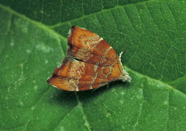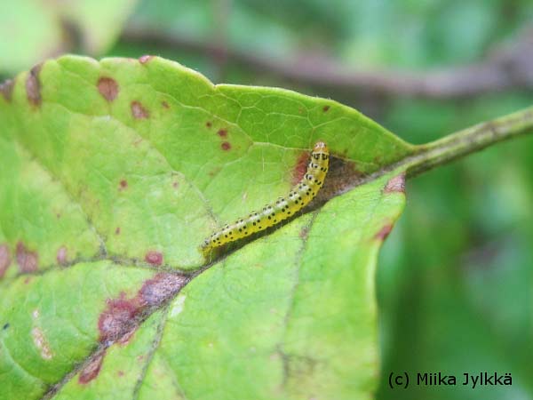z čeledi molověnkovitých (Glyphipterygidae). Rezavění listů způsobuje žír housenek, které listy ze spodní i svrchní strany skeletují. Později se listy stáčejí a uvnitř vzniklé trubičky se housenky skrývají. Napadené listy rychleji hnědnou, jejich nervatura se zbarvuje rezavě červeně a silně napadené stromy jsou jako spálené. Housenky jsou velmi pohyblivé a při vyrušení sebou prudce mrskají a snaží se po vláknech spustit k zemi. Dospělé housenky přelézají na nepoškozené listy a na nich se kuklí v bílých zámotcích. Po několika dnech pak z kukly vyletuje dospělý motýlek.