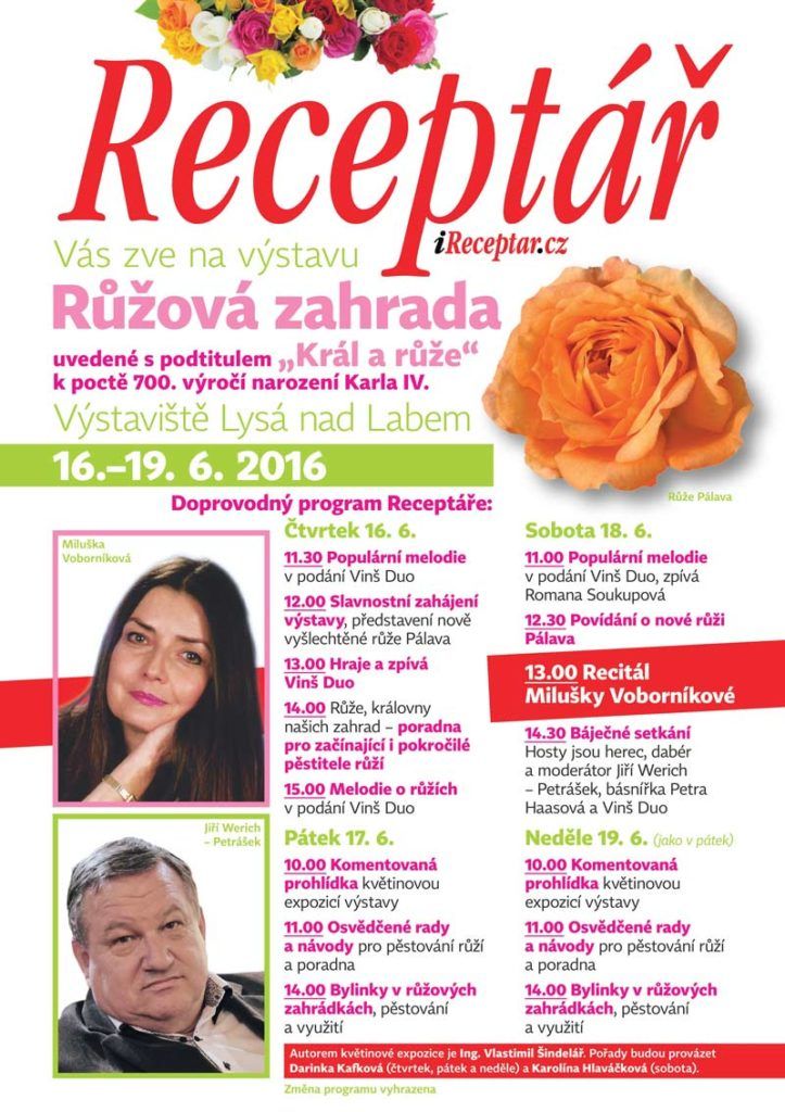 Tradiční celostátní výstava růží a ostatních letních květin RŮŽOVÁ ZAHRADA 2016, která přinese novinky ve šlechtitelské práci, kouzelná aranžmá řezaných i rostlých růží, odborníci poradí jak na choroby a škůdce našich zahrad a prodejci nabídnou tisíce růží, letních květin, ovocných i okrasných stromků, keřů, zahradní techniku a nábytek.