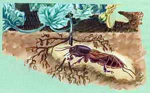 Dalším způsobem je vyrývání hnízd, která poznáme podle kruhu uschlých rostlin. Na záhonech však tato místa nemusí být dostatečně patrná. Vyrýpnuté hnízdo vypadá jako hrouda o průměru asi sedm centimetrů s jedním otvorem. Uvnitř je dutina, kterou samička vytlačila svým štítem.