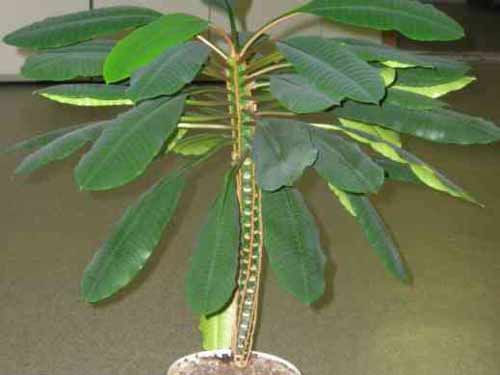 Olistěné druhy ilustruje kříženec populární „Kristovy trnové koruny“ – Euphorbia milii, cv. Marathon. Botanický druh E. mílii se pod prvním názvem E. splendens pěstuje v Evropě již od roku 1829. Vyobrazený hybrid na str. 3 – vydrží kvést nepřetržitě 365 dní v roce! To není žádný reklamní slogan, to je skutečnost, kterou si ověřily již desetitisíce milovníků pokojových rostlin v Evropě i v zámoří. Květenství se tvoří nad každým novým listem a při stálé pokojové teplotě tento madagaskarský druh roste bez znatelné přestávky. Množí se řízkováním, jehož úspěšnost podporuje dostatečně zaschlá řezná rána a spodní teplo, kterým asi na 20 °C ohříváme množárenský substrát. Jednotlivé řízky pak ideálně koření pod krytem z mikrotenového sáčku.