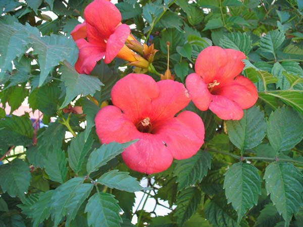 Trubač kořenující – Campsis radicans se podobá předešlému druhu, květy má však o trochu menší, vně oranžové, uvnitř šarlatové, trubkovité, podobné malým gloxíniím, uspořádané ve shlucích. Tento druh, původem ze Severní Ameriky, dorůstá do výšky 8 m, ve vinorodých oblastech až do 10 m a má více přísavných destiček než trubač velkokvětý. Trubač kořenující se pěstuje v zahradách už od roku 1640.