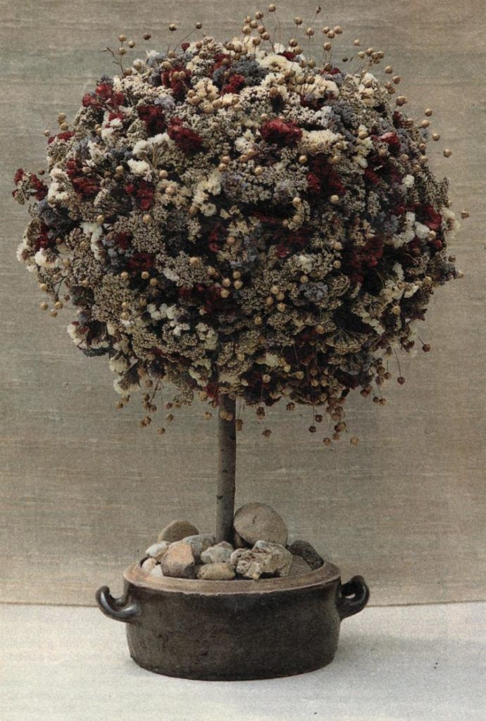 Jak na to? Nejprve si připravíme větší koš nebo květináč, který vyložíme igelitem a pak naplníme většími kameny. Mezi kameny zakotvíme a zasádrujeme silnější dlouhou větev, která nahradí kmínek. Na vrchol připevníme kouli z florexu nebo ze svázané slámy popřípadě mechu. Do tohoto podkladu vpjchujeme jehličnaté větévky. Mezi ně pak i suché květiny navázané na drátech. Dost nezvyklou, ale efektní výzdobou jsou girlandy.