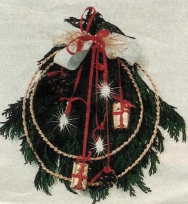 Nejprve si položíme chvojí do ploché kytičky, navrch dáme větvičku jmelí a svážeme drátem nebo provázkem. Z drátu si připravíme jeden nebo dva různě velké kruhy, ty omotáme stužkou. Kruh na fotografii je pro obměnu odrhán lesklou bavlnkou s bílým provázkem. Dva kruhy spojíme k sobě a v tom místě přivážeme k zelené kytičce. Krabičky od zápalek zabalíme do ozdobného papíru, uvážeme na nich mašličku tak, že jeden konec stužky necháme delší. K šiškám si nejprve připevníme drát, který zachytíme za poslední rozevřené šupiny. Oba konce drátu spojíme skroucením, ponecháme malé očko, protáhneme jím stužku. Uvážeme mašličku a opět stužce ponecháme delší konec. Všechny různě dlouhé stužky s ozdobami si rozložíme na závěsu a připevníme k úvazku. Ten nakonec zakryjeme velkou mašlí. A zbývá jen přivázat z druhé strany poutko na zavěšení.