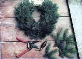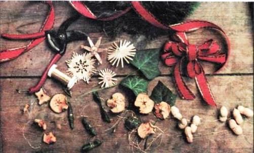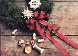 Nyní si připravíme jednotlivé ozdobné prvky. Šípky navlékneme na pevný drát, svíčky opatříme na koncích drátky. Drátek nahřejeme a zasuneme do svíčky. Je lépe opatřit každou svíčku dvěma dráty, aby se netočila. Z malého svazečku sena vytvoříme střapečky, ovážeme lýkem, hnědým provázkem nebo červenou vlnou. Listy břečťanu složíme do balíčku a omotáme zlatým drátkem. Kolečka křížal navlékneme silnou jehlou na zlatý drátek a uděláme závěsy. Menší pěkně vybarvená jablíčka upevníme tak, že středem propíchneme silnější na konci ohnutý drát (viz kresba). Máme li vše připravené, můžeme začít umisťovat zeleň. Začneme větvičkami jehličnanů, které šikmo zapichujeme do mokré hmoty. Na koncích jehličí odstraníme, aby v oasisu lépe držely. Potom zapíchneme do středu dekorace svíčky. Nesmějí být příliš blízko sebe, aby se navzájem ne-opalovaly. Dále umístíme zlatým drátkem omotané metlice jalovce. Doplníme další zelení a vyplníme mezery, aby nebyl vidět oasis.