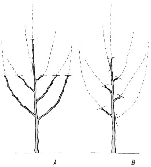 V případě podzimní výsadby se jednoleté postranní výhony zkracují na jaře o jednu až dvě třetiny jejich délky tak, aby po řezu zůstaly v jedné rovině. Dále se hladce u kmínku odřízne, nejlépe ostrým zahradnickým nožem, konkurenční výhon, popř. další konkurující výhony, u peckovin jen tehdy, ne-jsou-li příliš silné; v opačném případě se zkracují podle principu Zahnova řezu na oslabeně aktivní čípky. Terminální výhon se seřízne podle druhu, odrůdy a systému pěstování o 0,1 až 0,3 m nad úrovní zkrácených postranních výhonů. Při jarní výsadbě nutno postranní výhony řezat více, většinou na dva až tři vyvinuté pupeny. Vždy platí, aby nejvrchnější pupen směřoval ven z korunky.