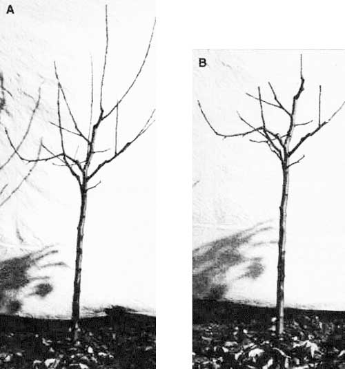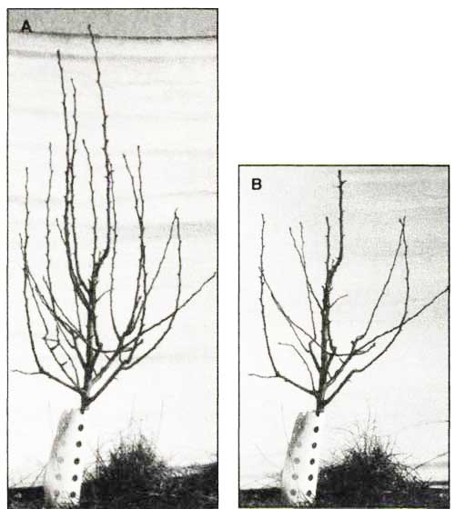 Bude to rozdílné podle ovocného druhu, způsobu pěstování, sponu výsadby a použité podnože. V každém případě by však měl být dostatečně silný, pro vřetena jabloní a hrušní s několika (5 až 7) dobře vyvinutými postranními výhony s tupým úhlem odklonu od terminálu (střední osy). Může být jednoletý i dvouletý. Z našich školek dáváme u jabloní a hrušní přednost dvouletému stromku s dobře zapěstovanou korunkou. Jednoleté očkovance bývají často bez předčasného obrostu (obr. 1). U peckovin bude naopak pro výsadbu vhodnější správně zapěstovaný jednoletý silný štěpovanec než přerostlý stromek dvouletý, který se hůře ujímá.