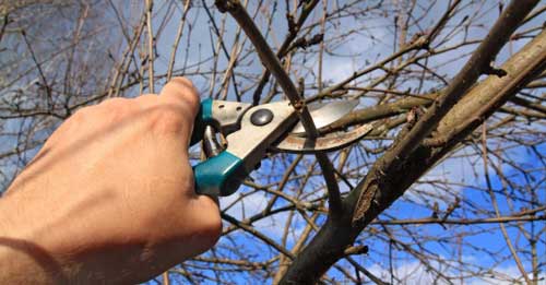 Každé příznivé počasí využijeme k prořezávání stromů. Silné větve odřízneme hrubou pilkou o něco výše nad zamýšleným řezem. Po odříznutí větve použijeme jemnější pilku, kterou odřízneme zbývající pahýl a rány zatřeme štěpařským voskem.