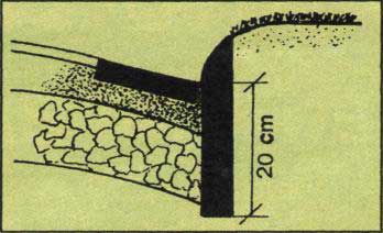 Použijeme-li betonové obrubníky, dbáme, aby nad okraj cestičky přesahovaly nejvýš pět až sedm centimetrů. Obrubník má zaoblenou stranou ladně navazovat na trávník nebo záhon. Varujme se hranatých obrubníků z různě postavených cihel, lahví od piva apod., které jsou* vrcholem nevkusu, stejně jako trpaslíci a jiné sádrové příšerky. Betonové zaoblené obrubníky jsou vkusné, ušetří pracné obseká-vání trávníku a vydrží neomezeně dlouho. Děláme je dvacet pět centimetrů vysoké, z toho je výška obloučku kolem pěti centimetrů. Lepší jsou obrubníky s postranní drážkou, neboť je nemusíme spojovat cementem. Do okrajů cest můžeme zabudovat betonové, cihlové nebo kamenné svodnice vody.