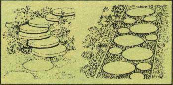 V trávníkových plochách jsou velmi hezké tzv. šlapáky – ploché kameny nebo betonové desky, které nahrazují cestu. Tyto desky pokládáme na vzdálenost kroku, to je asi šedesát centimetrů od středu do středu desek. V trávníku ke garáži je pokládáme v šíři rozchodu kol automobilu s mezerami kolem deseti centimetrů mezi jednotlivými deskami.