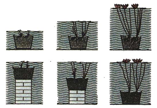 Vodní rostliny sázíme do těžší, hlinité, zahradní nebo polní zeminy se starou dmovkou (krtiny z louky) a trochou písku s jílem, zlepšenou zetlelým hovězím hnojem. Nikdy nepoužíváme bahno z rybníka, které v sobě nemá dost živin. Sázíme tak, aby jezírko nebylo přeplněno, ale aby nejméně polovina vody zůstala volná. Lekníny sázíme od konce května metr a půl od sebe. Vršek zeminy přikryjeme mechem, který přivážeme rybářským vlascem, hliníkovým drátem apod., aby mech ze zeminy neodplavával.