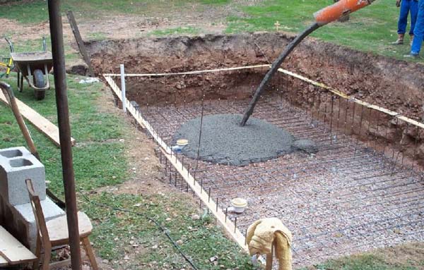 Před betonováním bazénu nebo nádrže si připravíme dřevo na bednění a silné železné dráty na výztuž betonu (armaturu), kterou spojujeme svářením nebo silnějším drátem. Nejlépe je udělat celé bednění a výztuž a pak betonovat najednou. Mřížovou výztuž umístíme asi pět centimetrů nad vyhloubeným dnem. Dno zalijeme betonem a několik hodin počkáme, až mírně ztuhne. Potom spustíme bednění na dno, vyrovnáme je, dobudujeme vnější bednění a uděláme výztuž. Beton na dně bednění pokropíme a vybetonujeme všechny čtyři stěny najednou.